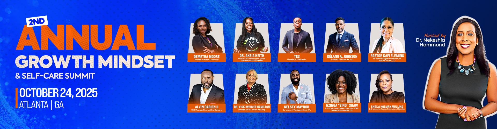 Get ready to recharge, refocus, and reignite your mindset at the 2025 Growth Mindset & Self-Care Summit in Atlanta, GA. Hosted by USA TODAY best-selling author and award-winning psychologist Dr. Nekeshia Hammond, this immersive one-day event is designed for high-achieving professionals who are ready to prioritize their mental wellness, reset their thinking, and elevate both their personal and professional lives.